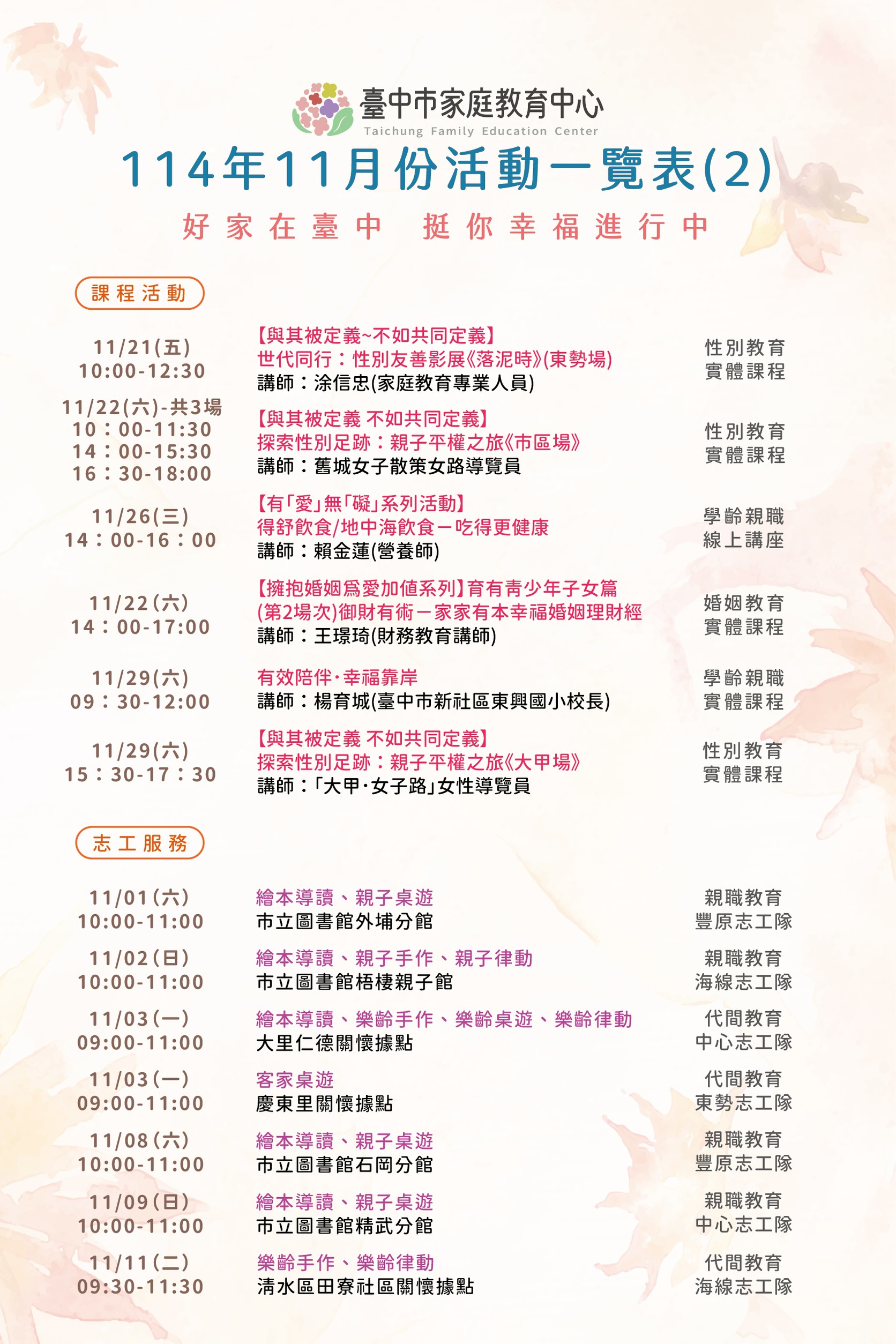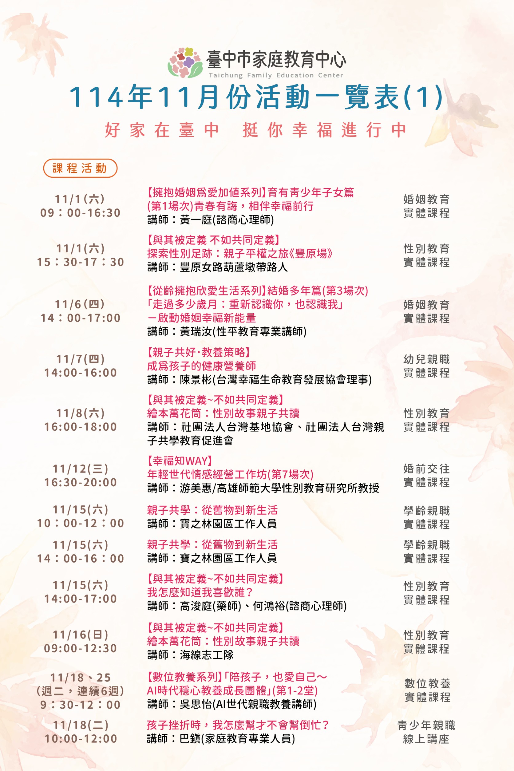🍁臺中市家庭教育中心邀您一起參與本月精彩多元的課程活動~從親職教育、數位教養、婚姻經營、青少年溝通、情緒管理、幼兒教養到到多元型態家庭學習、婚前交往準備等主題應有盡有,讓我們在溫馨互動的氛圍中學習,累積創造幸福、和諧家庭的力量!