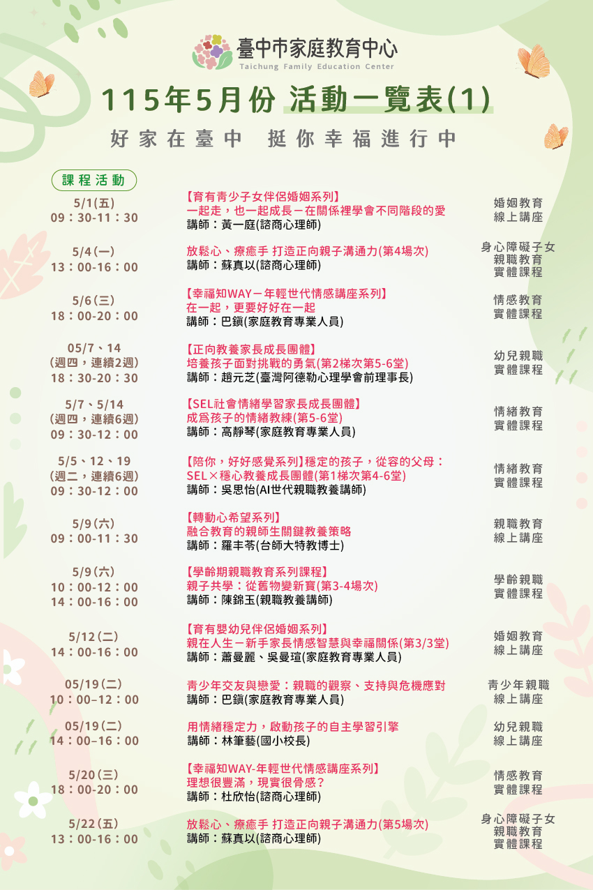 【轉知】臺中市家庭教育中心115年5月份活動一覽表